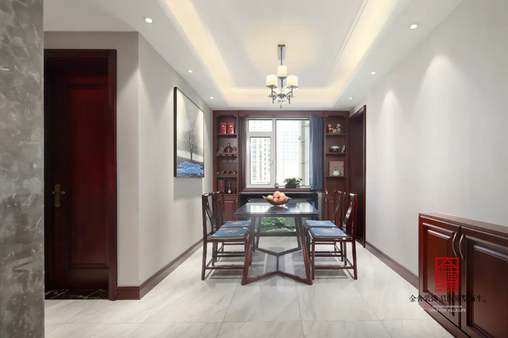 此案例為石家莊金舍裝飾-保利拉菲公館150平米新中式風格裝修實景。新中式風格發展到現在就像是一個已經趨近飽和的瓶子一樣,有水進去自然就會有水流出。對于中式風格來說,每個元素都是不可或缺的一部分,從古代石刻窗格的各種吉慶元素,到現在已經簡化到只剩下核心的顏色和少量的配飾,拋繁就簡,回歸平淡,這是一種發展,也是一種人們對于簡單生活的憧憬和向往。