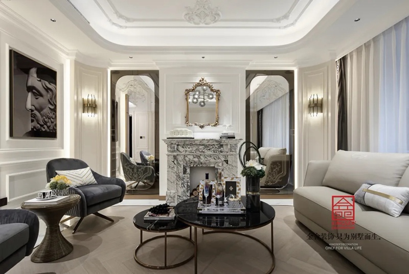 客廳背景墻以質(zhì)感的大理石壁爐與金屬的配色碰撞時(shí)尚冷色的美式風(fēng);而與之對(duì)應(yīng)的另一側(cè)則有溫馨感的中式山水寫(xiě)意,時(shí)尚的黑白掛畫(huà)散發(fā)出一種迷人的氣息,灰色系的家具則與家居配飾完美的呼應(yīng)。