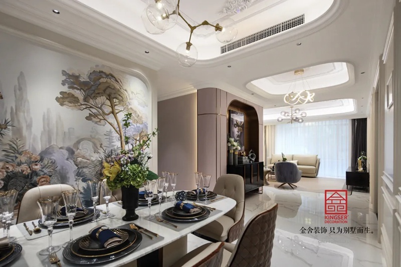 此案例為石家莊金舍裝飾-唐宮原著樣板間168平米裝修實(shí)景。以都市精英追求物質(zhì)生活的豐富多彩,又對(duì)自然藝術(shù)品位有極高的要求為出發(fā)點(diǎn),將現(xiàn)代輕奢的設(shè)計(jì)與時(shí)尚格調(diào)相融合,作為家庭日常生活主要活動(dòng)的共有空間,韻律是潛心醞釀的順理成章,而品味則是空間里的無(wú)名英雄。以現(xiàn)代視野做基調(diào),在百折千回的婉轉(zhuǎn)中獲取靈感,藏巧在空間中,隱思于時(shí)間里。