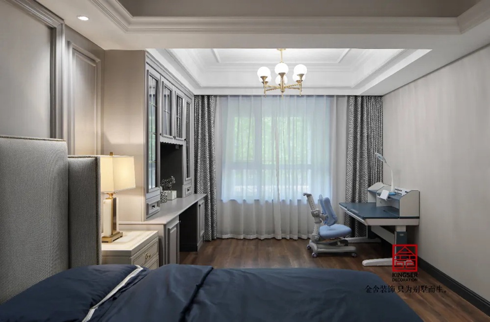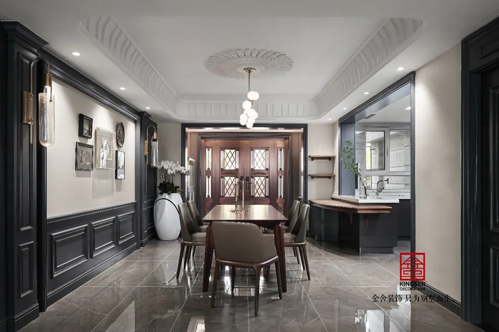 此案例為石家莊金舍裝飾-御河上院220平米新古典風格裝修實景。 新古典風格從簡單到繁雜、從整體到局部,精雕細琢、鑲花刻金都給人們留下一絲不茍的印象。它一方面保留了材質、色彩的精致風格,可以很強烈地感受到悠久的歷史痕跡與渾厚的文化底蘊,同時又摒棄了過于復雜的肌理和裝飾,簡化了線條。