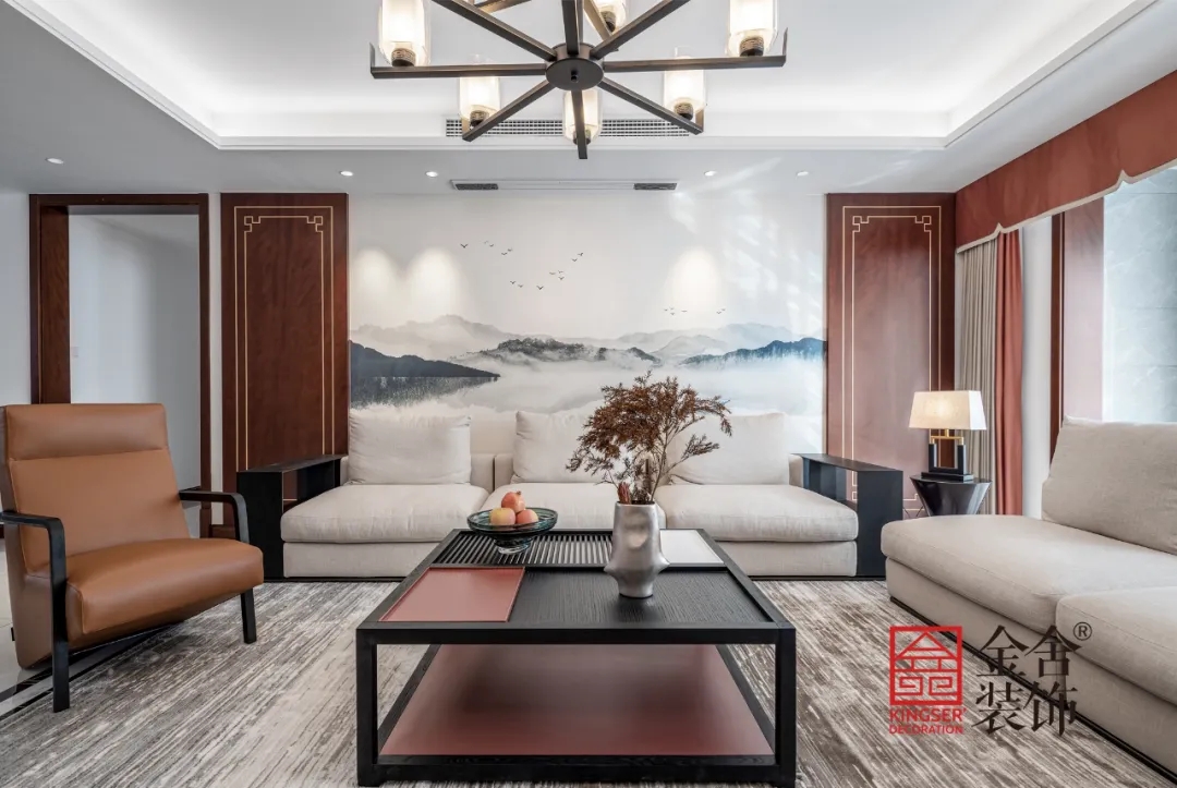 電視墻的山水寫意中山巒孤鴻,氣象萬千,延展出無窮無盡的意象。巧克力色木質(zhì)墻板,銀樺色的地面,線型感十足的吊燈,皮質(zhì)沙發(fā)與布藝沙發(fā)的混搭,可以說家居內(nèi)的每一個組成都在對你訴說著“東方韻味”的故事。