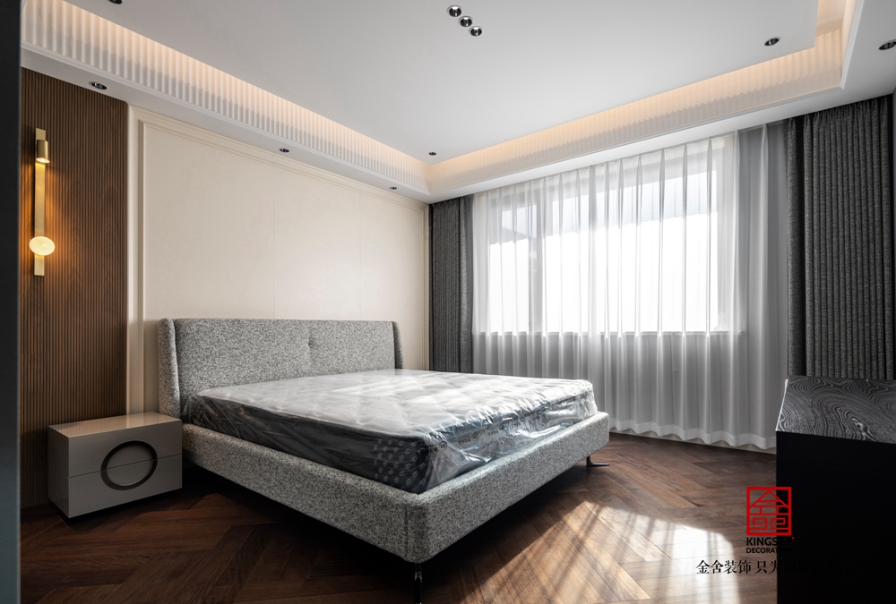 三層的空間就屬于完全的靜區了,除了一個三合一套間式的主臥之外還有一個書房。主臥完全采用深棕色木地板,吻戲而舒適,玻璃磚的設計保證了走廊的采光,將近四十平的臥室也給人一種氣派而美觀的感覺。