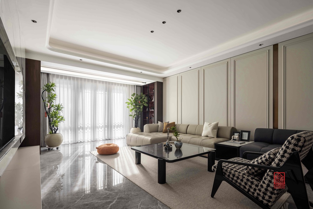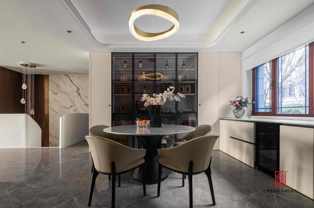 褪去城市繁冗華麗的外殼,回歸至與人的內在共鳴,斑駁的光影在客廳空間徜徉,大理石與墻板的搭配,釋放出一種優雅、沉靜及治愈的氛圍感,貫穿于整個別墅裝修空間的動線。