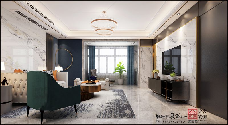 客廳的空間開敞、內外通透,在空間平面設計中追求不受傳統對稱限制。自由開放,力求創造出時代精神,獨具新意的裝飾,設計簡單、通俗、清新,更接近人們生活。