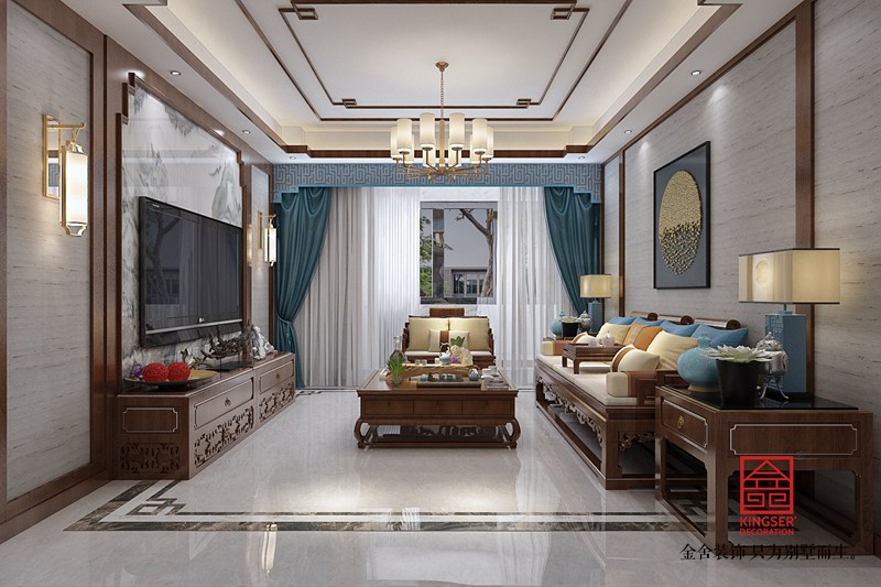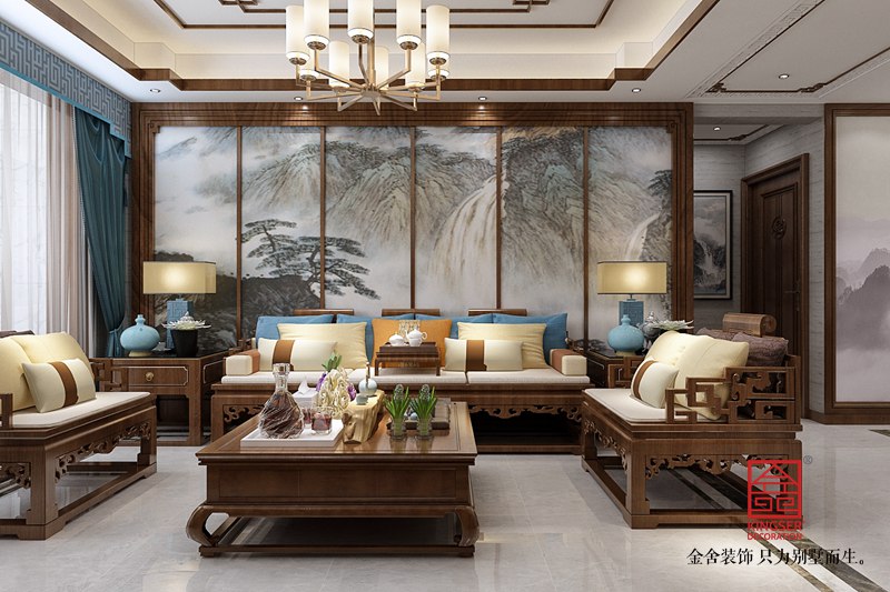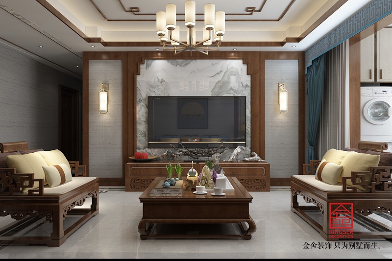 本案為石家莊金舍裝飾-東南智匯城132平米中式風格裝修效果圖。中式風格的設計不同于現代風格的簡約型設計,通過對傳統文化的認識,將現代元素和傳統元素結合在一起,以現代人的審美需求來打造富有傳統韻味的事物,體現出了中國傳統的古典藝術韻味。本案造型上選擇簡潔、硬朗的線條設計,在圖案上要求精致,而且多樣式的線條可以使空間顯得有層次感,明清的中式家具打造一種沉穩厚重的裝修效果。處處體現著濃郁的東方色彩,氣勢恢宏、壯麗華貴,電視墻采用中式風格最講究的對稱造型,與中間的石材山水圖案渾然一體,簡潔大方,不失韻味