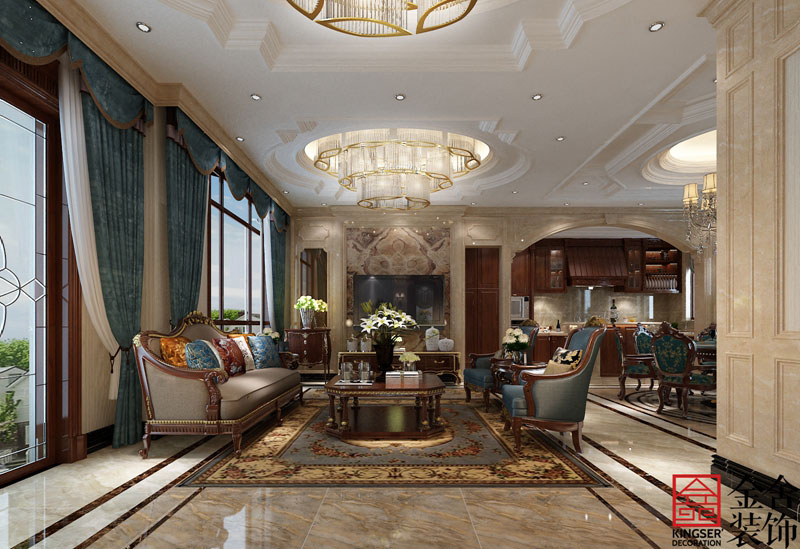 客廳:美式客廳風(fēng)格較多采用嵌入式石膏吊頂,搭配精致的水晶吊頂,營(yíng)造出一種懷舊、浪漫的感覺(jué)。以大理石作為地面裝飾材料,石材作為墻面裝飾材料,光澤感極佳,在沙發(fā)區(qū)域鋪上大幅花紋地毯,使空間區(qū)域劃分更加清晰。復(fù)古造型的組合沙發(fā),以及茶幾都具有上乘的質(zhì)感,讓美式古典風(fēng)格更加的彰顯。