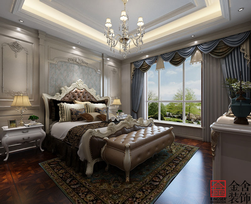 臥室:美式風(fēng)格臥室通常是以功能性和使用舒適度為主要設(shè)計(jì)。在臥室中飾品大多都是用的成套布藝來(lái)裝飾空間的。