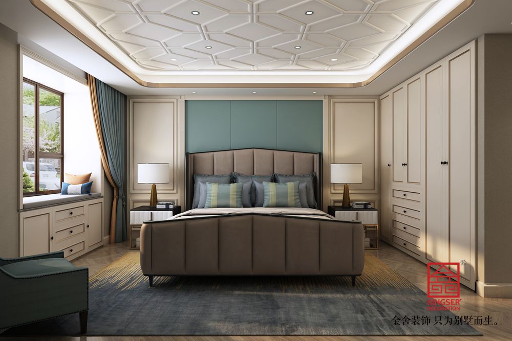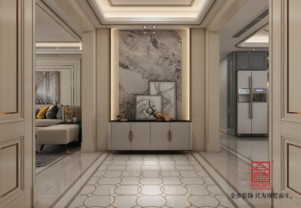 設計說明:此案例為石家莊金舍裝飾-榮盛華府205平米美式風格裝修效果圖。美式風格的客廳面積很大,看上去就很氣派,加上非常有質感的家具,盡顯奢華意境,美式風格的裝修很注重各種線條的裝飾,吊頂和墻面上都有美觀的線條,水晶吊燈更是增加了整個客廳的亮度,同時也提升了檔次,墻面上的掛畫非常有藝術氣息,體現了主人的文化底蘊,在這樣的客廳里家人一起休閑娛樂或是招待客人都是非常好的。