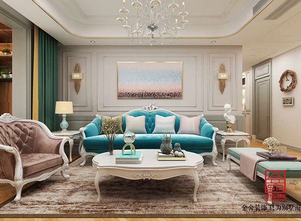 設計說明:此案例為石家莊金舍裝飾-東南智匯城126平米法式輕奢風格裝修效果圖。藍色系具有立體感的沙發顏色,使墻面很顯層次感;多彩的地毯、靈動設計的臺燈、不拘一格的掛畫,營造出一幅自由、溫馨、浪漫的氛圍;而客廳旁的落地窗給足了這間空間明亮的自然采光,用餐區域餐桌上方的水晶吊燈與客廳中的精致吊燈遙相呼應,讓整個空間之中都映射出一種浪漫氛圍,法式風格如同法國這個國家一樣,浪漫迷人,仿佛普羅旺斯的陽光,灑滿你的家。藍色調營造浪漫時尚法式風情,尋求心靈的自然回歸感;將法式傳統的三顏色與當季流行色融合,不失法式的貴氣和浪漫