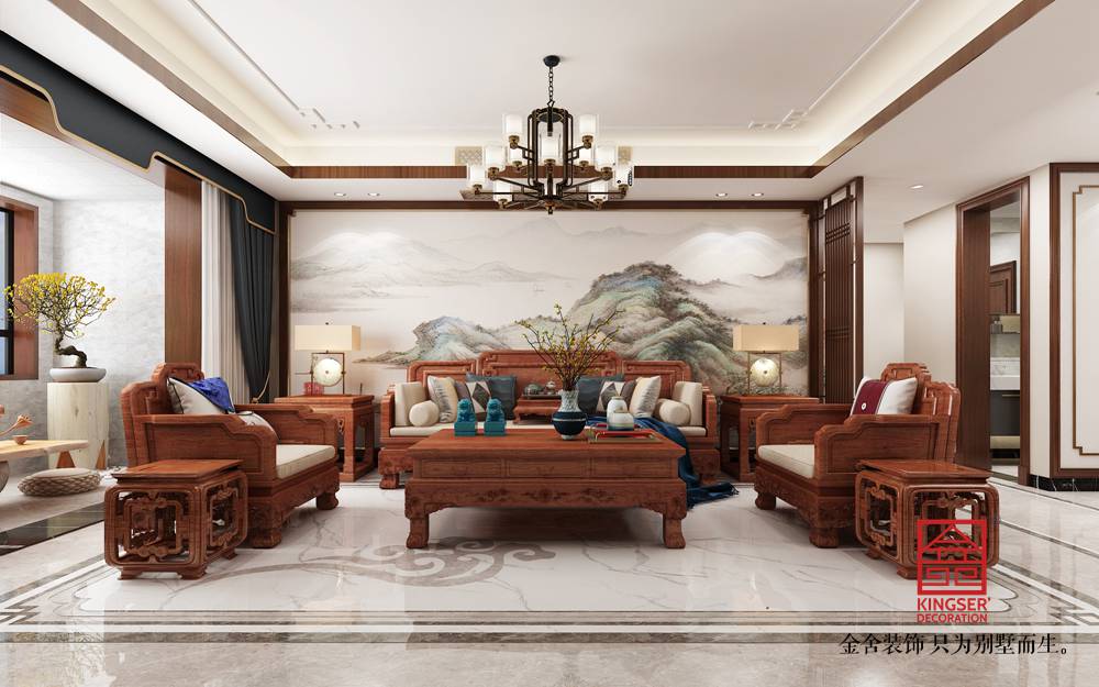 客餐廳空間添加了中式山水畫(huà)祥云圖案元素,使整體空間感覺(jué)更加豐富,大而不空、厚而不重,有格調(diào)又不顯壓抑