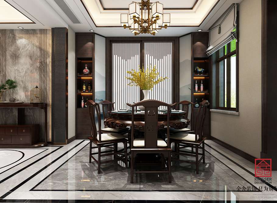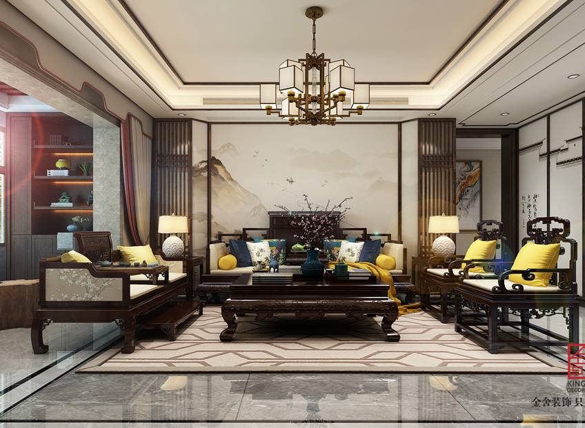 石家莊金舍裝飾-榮盛華府185平米新中式風格裝修效果圖。定位為新中式禪意風格,本方案的設計哲學是給人一種靜謐、平和、舒緩的感覺,新中式設計追求的是一種清新高雅的格調,注重文化積淀,講究雅致意境。以簡樸、舒適、隨意的特點給人很強的吸引力,搭配著新中式的紅木家具,為生活營造出一個寧靜、安逸、平和的風格。既繼承了傳統中式風格的固有理念和元素,又有現代設計理念的創新以及現代工藝的運用。當走進禪意新中式設計的房間,仿若走進了另外一種生活狀態。新中式的圈椅沙發,簡單大方的茶幾。讓人好不愜意。這種表現能夠完整地體現出居住人追求品質、典雅生活,視生活為藝術的人生態度。