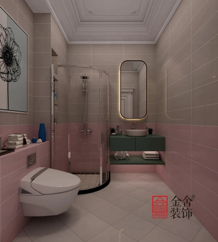 兩種不同形態的衛生間創造出兩種不同的效果,從簡潔對比奢華,從點線面的包豪斯感向著洛可可式的繁復遞進,不同的顏色塑造不一樣的家居感覺。