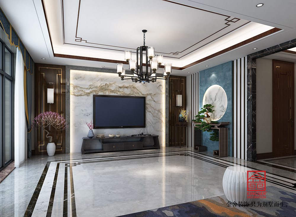 設(shè)計說明:此案例為石家莊金舍裝飾-大者280平米新中式風格裝修效果圖。將現(xiàn)代元素與傳統(tǒng)元素相互結(jié)合的形式而產(chǎn)生的,同時以現(xiàn)代人的觀點來體現(xiàn)出與傳統(tǒng)中國風格不一樣的設(shè)計。同時新中式風格大多數(shù)采用對稱性的設(shè)計,體現(xiàn)出一定的協(xié)調(diào)性。中國傳統(tǒng)的室內(nèi)陳設(shè)包括字畫、匾幅、掛屏、盆景、瓷器、古玩、屏風、博古架等物品來體現(xiàn)出中式風格,同時為了體現(xiàn)出室內(nèi)的現(xiàn)代感,又將中式古典的特色的裝飾物進行現(xiàn)代風格的再次設(shè)計,體現(xiàn)出新中式風格設(shè)計理念。