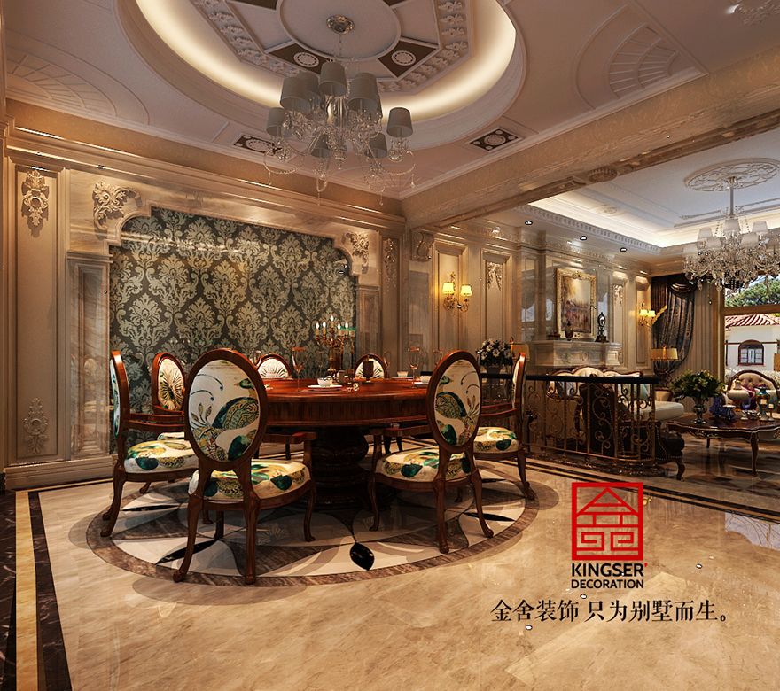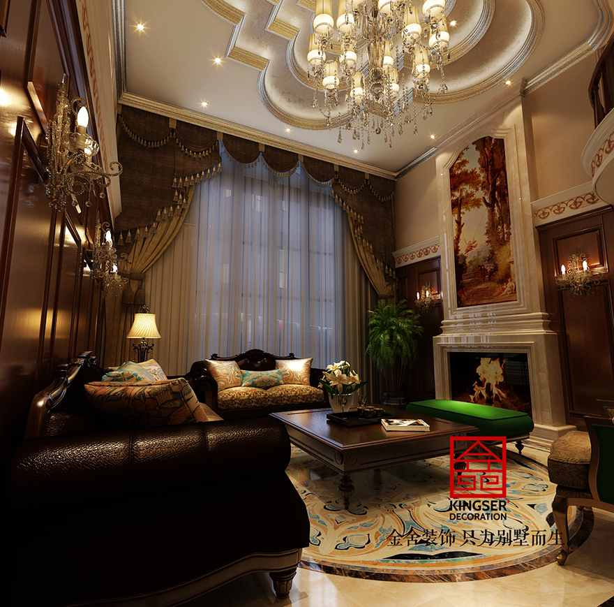 設計說明:此案例為石家莊金舍裝飾-原河名墅380平美式風格裝修效果圖。美式風格強調以華麗的裝飾、濃烈的色彩、精美的造型達到華貴的裝飾效果。美式客廳頂部用大型燈池,并用華麗的 枝形吊燈營造氣氛。門窗上半部做成弧形,并用帶有花紋的石膏線勾邊,室內則有壁燈造型。墻面用優質乳膠漆,以襯托 豪華效果。地面材料以石材和地板為主。美式客廳用家具和軟裝飾來營造整體效果,深色的像木和楓木家具,色彩鮮艷的 布藝沙發,都是本案美式客廳里的主角。還有浪漫的羅馬簾,精美的油畫,制作精良的雕塑工藝品,都是點染美式風格不 可缺少的元素。在美式家居空間里,在墻上掛金屬框抽象畫和攝影作品,選擇一些西方藝術名家的贗品,如人體畫,直接把西方藝術帶到家里,以營造濃郁的藝術氛圍,表現主人的文化素養。