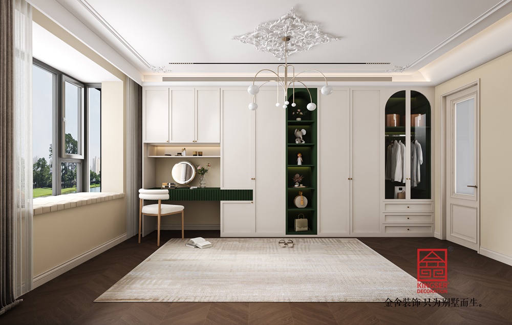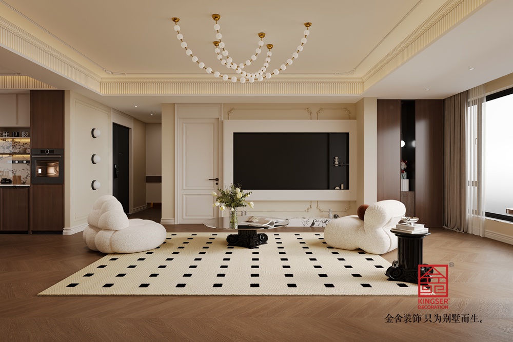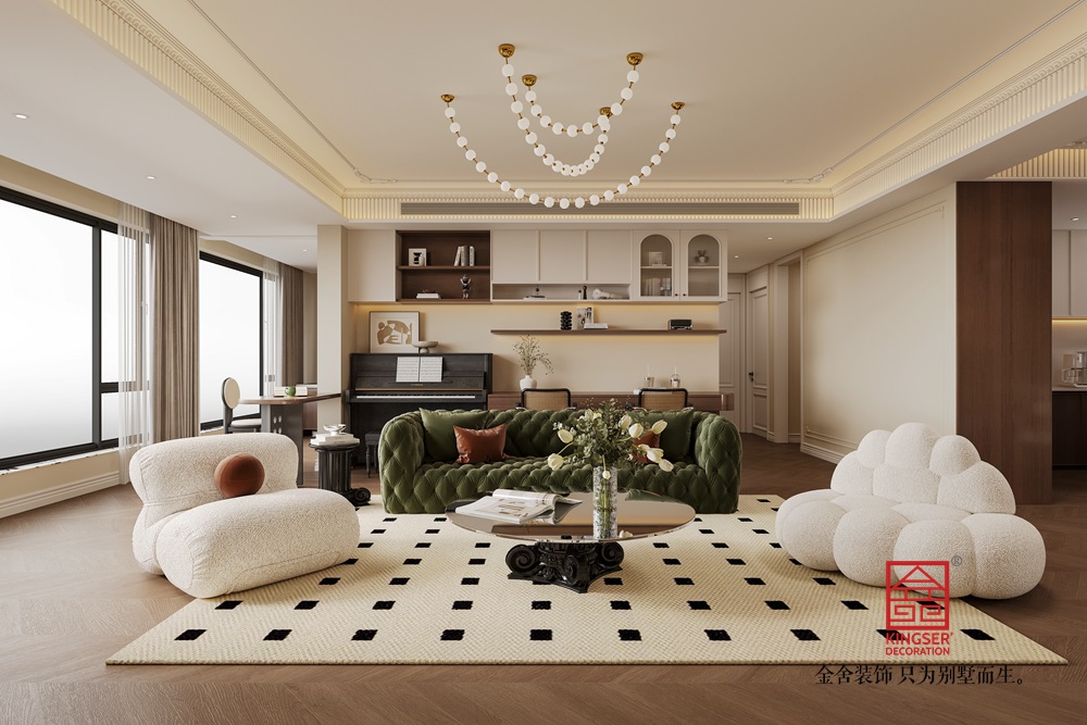 該客廳以中古風(fēng)為設(shè)計脈絡(luò),巧妙融合復(fù)古與現(xiàn)代元素。整體色調(diào)溫暖柔和,木質(zhì)地板與淺米色墻面相襯,營造出靜謐舒適的基底氛圍。 墨綠色絲絨沙發(fā),憑借其復(fù)古的紋理與飽滿的造型,成為空間視覺重心,搭配色彩協(xié)調(diào)的抱枕,盡顯復(fù)古優(yōu)雅。兩側(cè)造型圓潤、質(zhì)感柔軟的白色單人椅,為空間注入靈動與溫馨感,與沙發(fā)形成有趣的風(fēng)格對話。