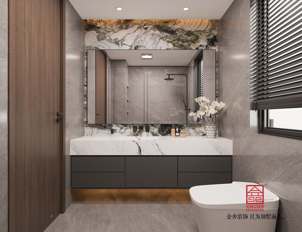 采用開放式布局,將觀影、休憩功能有機整合。線性燈光設計強化了空間縱深感,隱藏式燈帶與點光源結合,營造出柔和且富有層次的照明效果;大面積落地窗搭配百葉簾,保證采光的同時兼顧隱私,讓空間在通透與雅致間找到平衡。