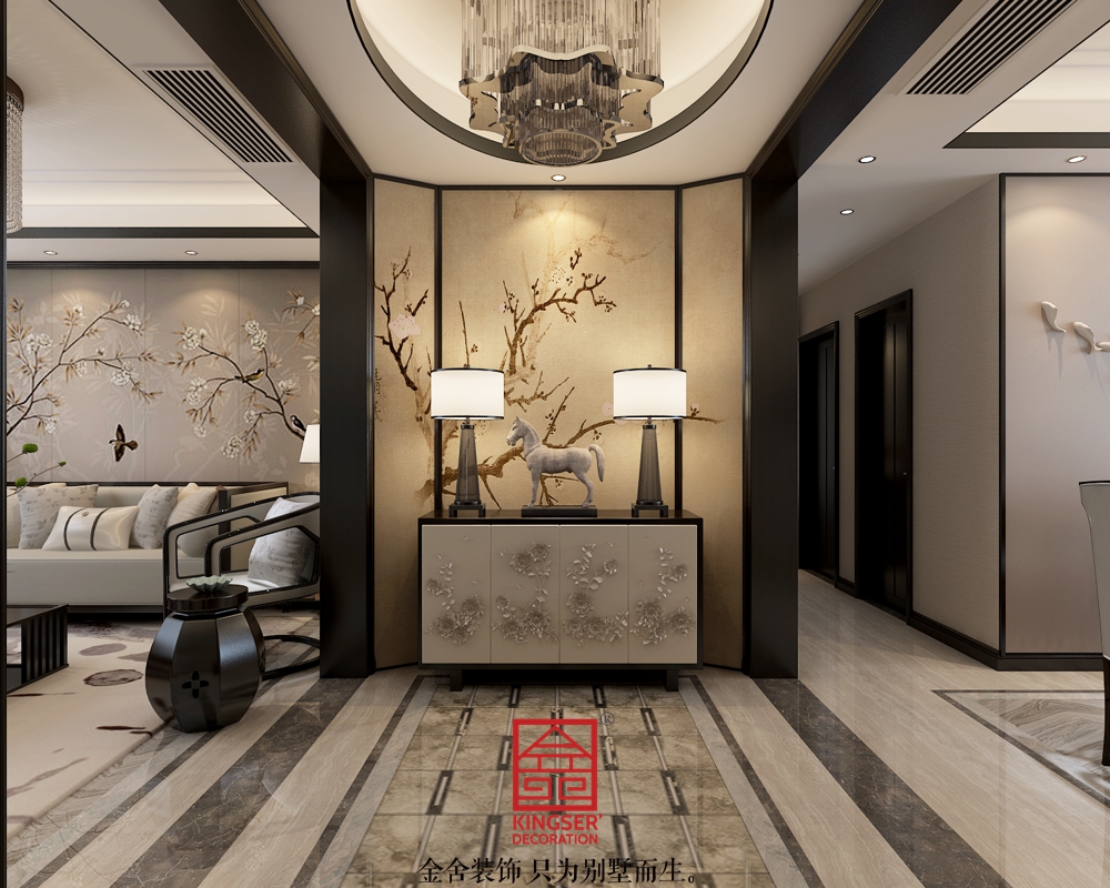 風格定位為新中式,把門廳空間做區域劃分,充分展現中式風格的對稱要求